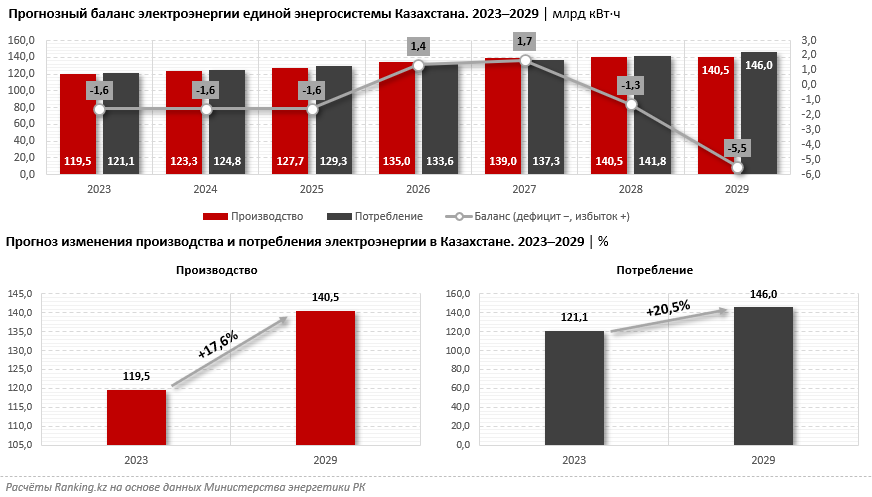 Do roka 2029 sa očakáva zvýšenie spotreby elektriky na 146 mld. kWh, čo oproti roku 2022 predstavuje 20,5%, z 121,1 mld. kWh. Naproti tomu sa očakáva nárast výroby elektrickej energie len o 17,6%. Podľa dlhodobých odhadov sa očakáva v roku 2029 deficit elektriky v Kazachstane 5,5 mld. kWh.