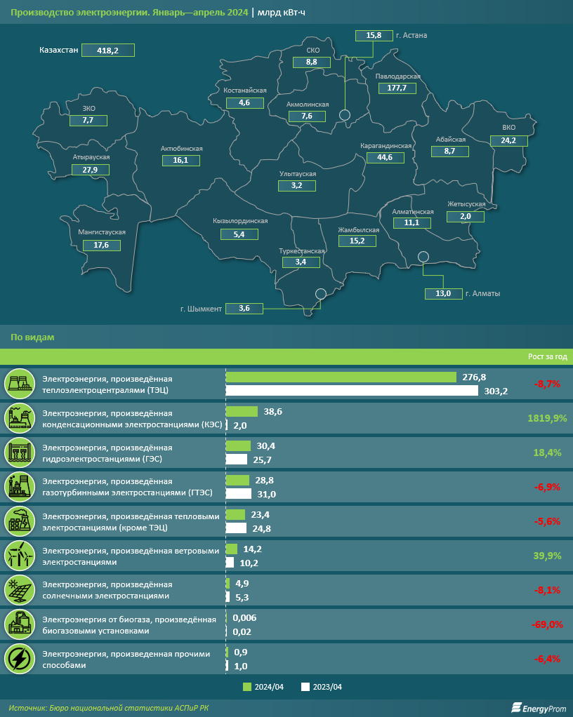 В производстве электроэнергии Казахстан опирается в основном на тепловые электростанции, на долю которых приходится до 66% общей генерирующей мощности. Производство на тепловых электростанциях за первые четыре месяца 2024 года даже снизилось на 8,7% по сравнению с аналогичным периодом прошлого года. Однако доля выработки на конденсационных электростанциях выросла с 2 кВт-ч до 38,6 кВт-ч, компенсировав снижение выработки на тепловых электростанциях. Аналогичным образом, выработка на гидроэлектростанциях выросла с 25,7 до 30,4 кВт-ч.